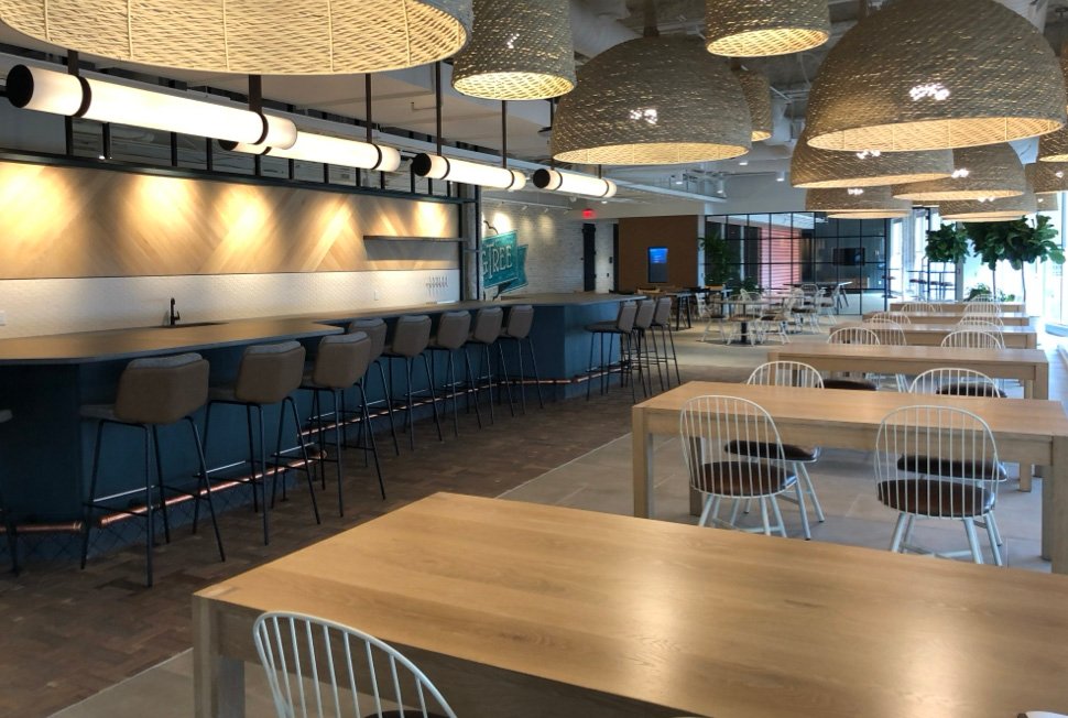 The custom tables at LendingTree’s headquarters were designed to bring versatility and warmth to the work café and common areas.